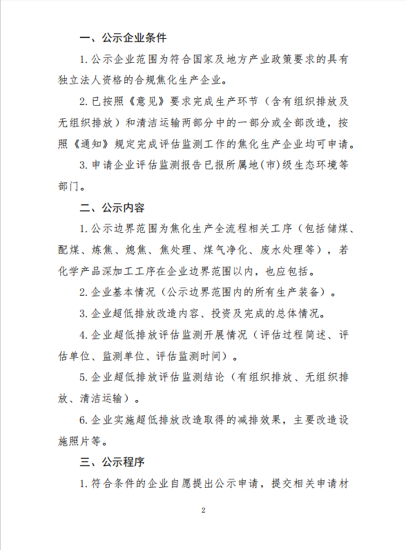 公示企業范圍為符合國家及地方產業政策要求的具有獨立法人資格的合規焦化生產企業。 已按照《關于推進實施焦化行業超低排放的意見》要求完成生產環節(含有組織排放及無組織排放)和清潔運輸兩部分中的一部分或全部改造,按照《關于做好水泥和焦化企業超低排放評估監測工作的通知》規定完成評估監測工作的焦化生產企業均可申請。申請企業評估監測報告已報所屬地(市)級生態環境等部門。